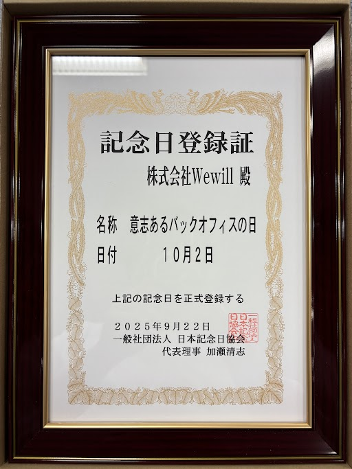 この度、2017年10月2日が当社の設立日であることにちなみ、10月2日を「意志あるバックオフィスの日」として日本記念日協会より正式に記念日として認定されたことをお知らせいたします。